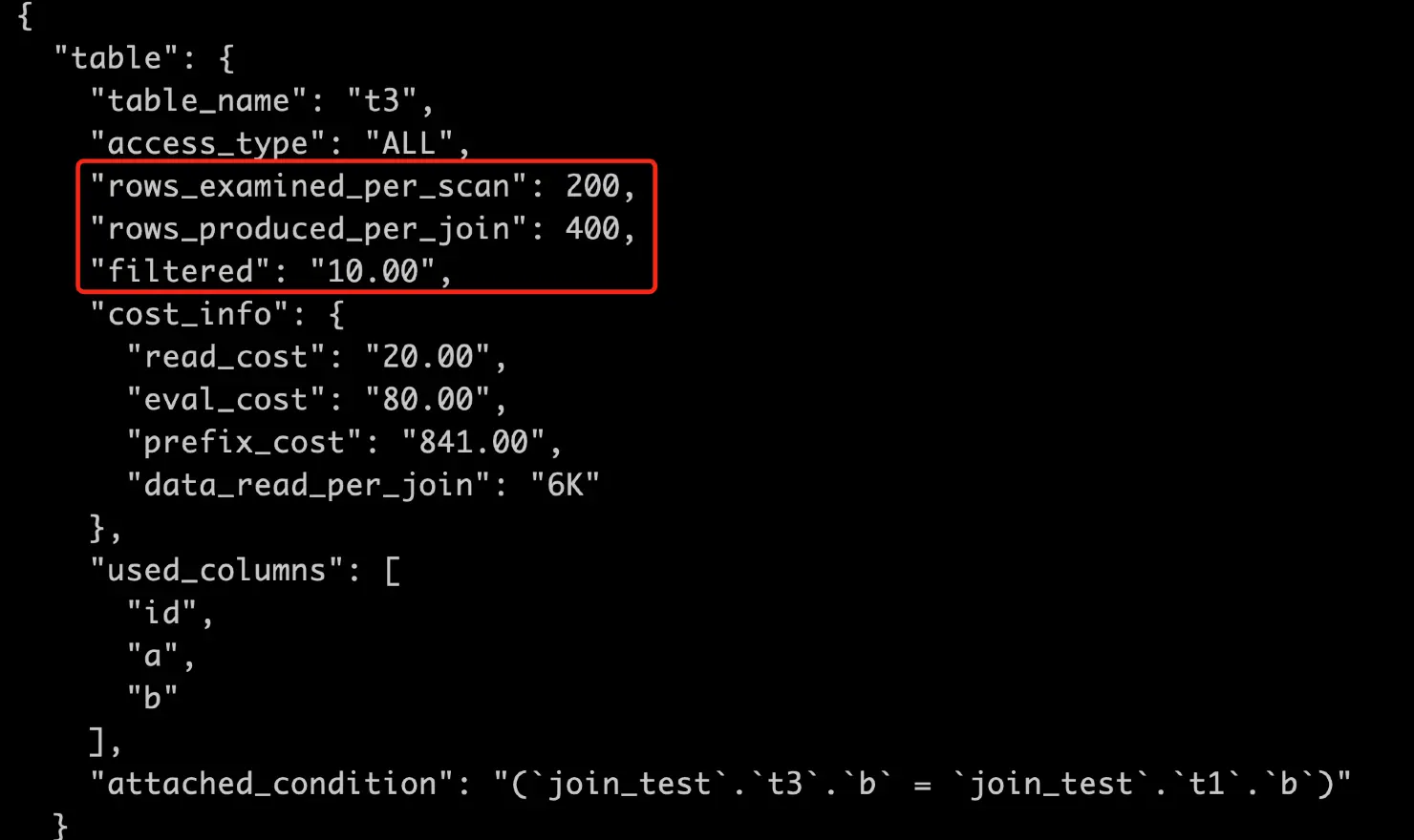t3 表实际的扇出只有 20,但优化器估算值是总扫描行数的 10%,由于 t3 表的关联字段没有索引,所以每次都要全表扫描 200 行,总的扫描行数=20 * 200=4000,扇出=4000 * 10%=400,比实际的 20 大了 20 倍。尤其对于后续表的 JOIN 来说,成本估算会产生更严重的偏差。