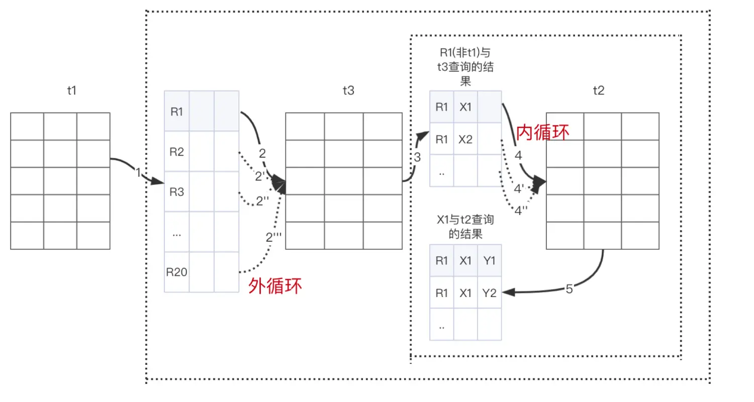 图示(这里展示的是索引嵌套循环算法时三表 JOIN 的流程,块循环嵌套算法不一样):