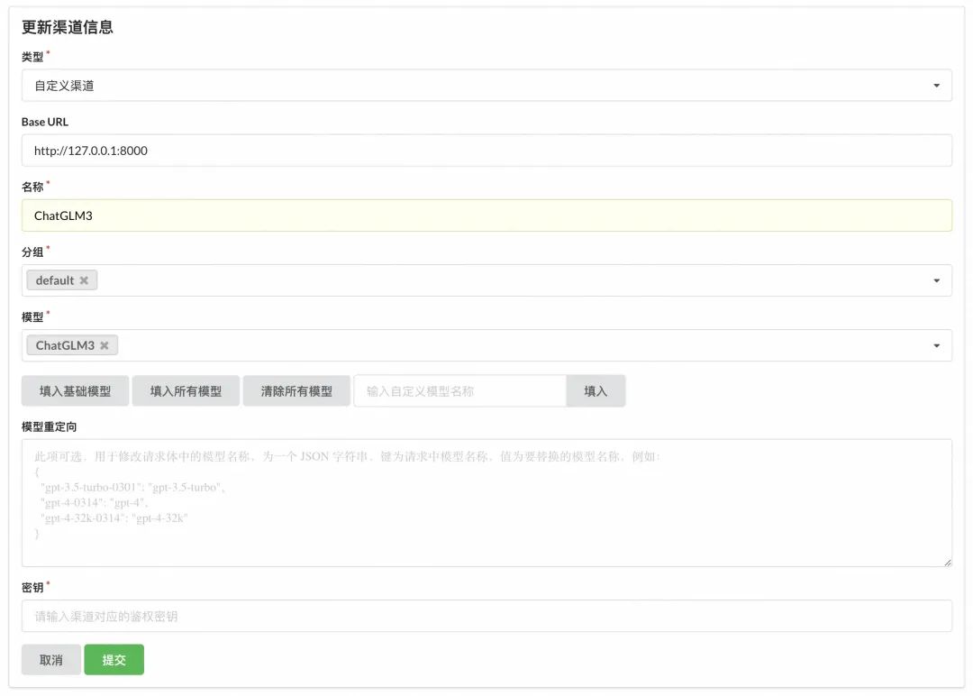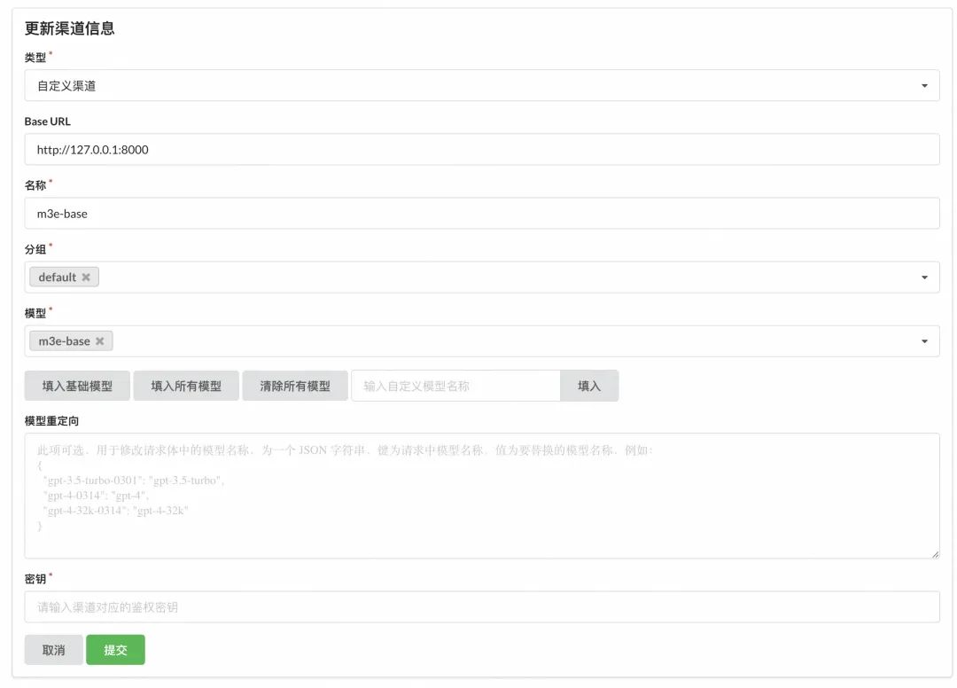 One API 里面预置了很多市面上的可用模型接口,好处是可以直接使用无需配置,缺点是没有添加自定义(本地)接口的能力。由于我们是自己搭建的 LLM 和 embedding 服务,需要修改其源代码,增加 ChatGLM3 和 m3e-base 的选项。