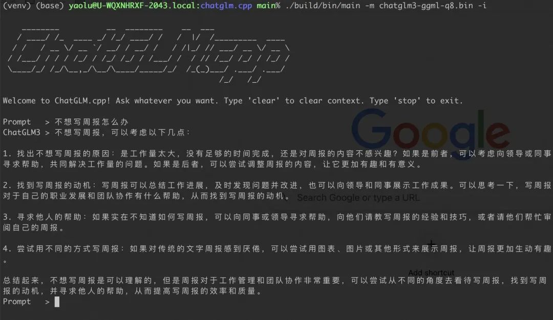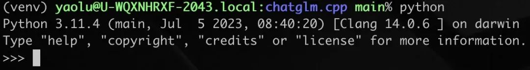 cd /Users/yaolu/AGI/github/chatglm.cpp# 先初始化 git 仓库git submodule update --init --recursive# 构建可执行文件cmake -B buildcmake --build build -j# 安装 Python 依赖pip install .