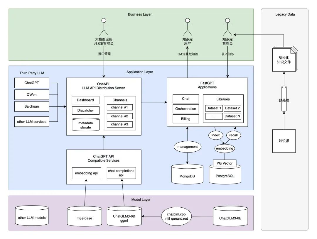 在这个环节里,我们采用类似 Dify.ai (地址:https://dify.ai/)的国产化开源 FastGPT 方案搭建属于自己的本地知识库应用平台。FastGPT 是一个基于 LLM 大语言模型的知识库问答系统,提供开箱即用的数据处理、模型调用等能力。同时可以通过 Flow 可视化进行工作流编排,从而实现复杂的问答场景。FastGPT 遵循 Apache License 2.0 开源协议,我们可以 Fork 之后进行二次开发和发布。
