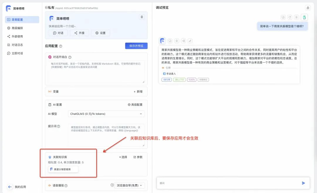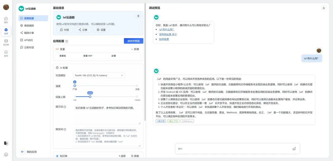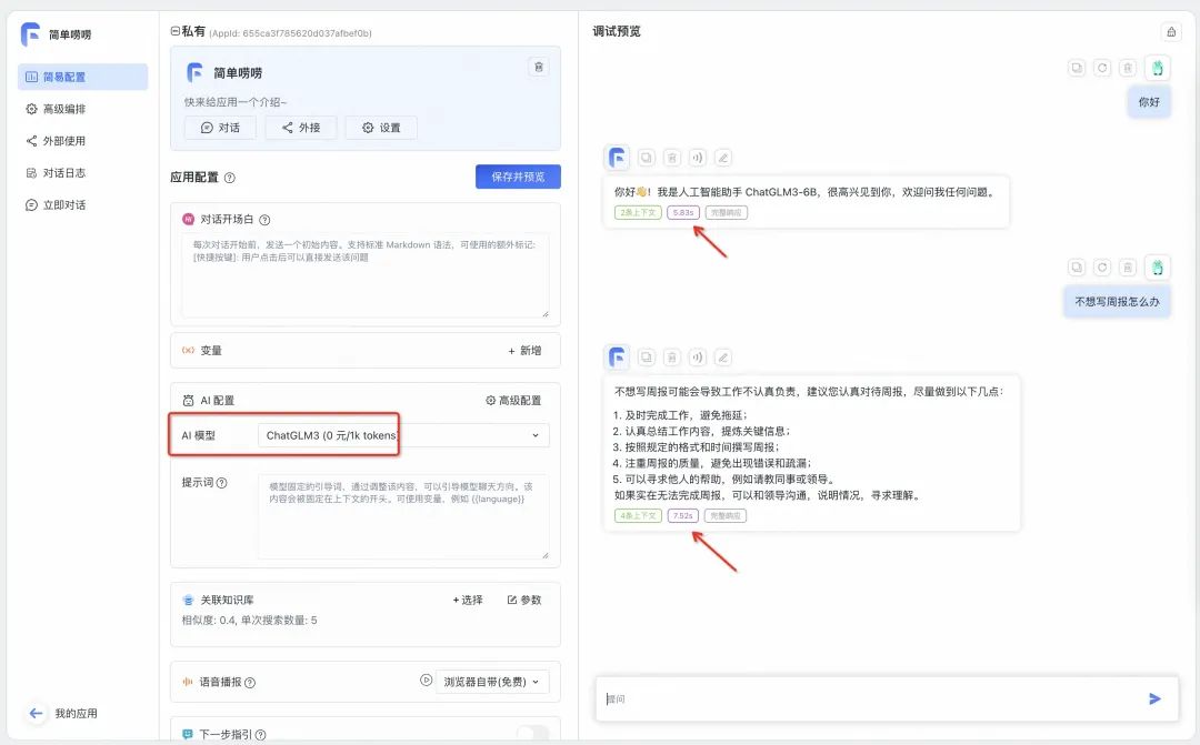 应用创建完成,进入对话界面,注意 AI 模型选择我们在 One API 里配置的 ChatGLM3。试着问他两个问题,可以看到推理速度还是很快的,分别是 5.83s、7.52s: