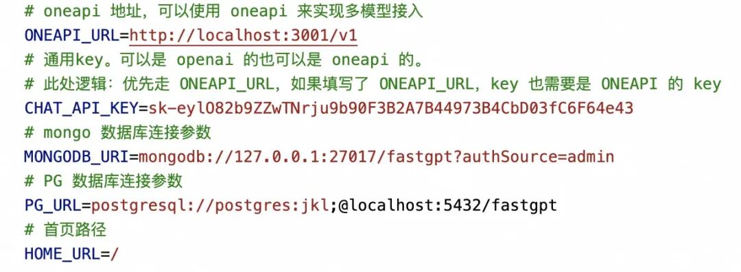 第一步,按照里面的步骤,配置 .env.local 文件内容,指定 One API、MongoDB 和 PostgreSQL 的访问地址: