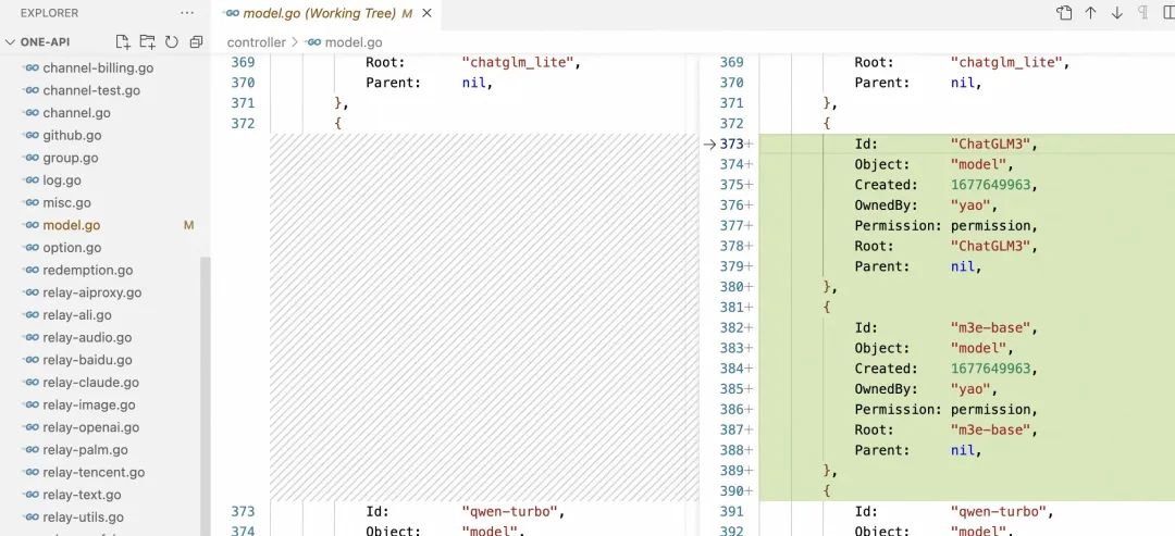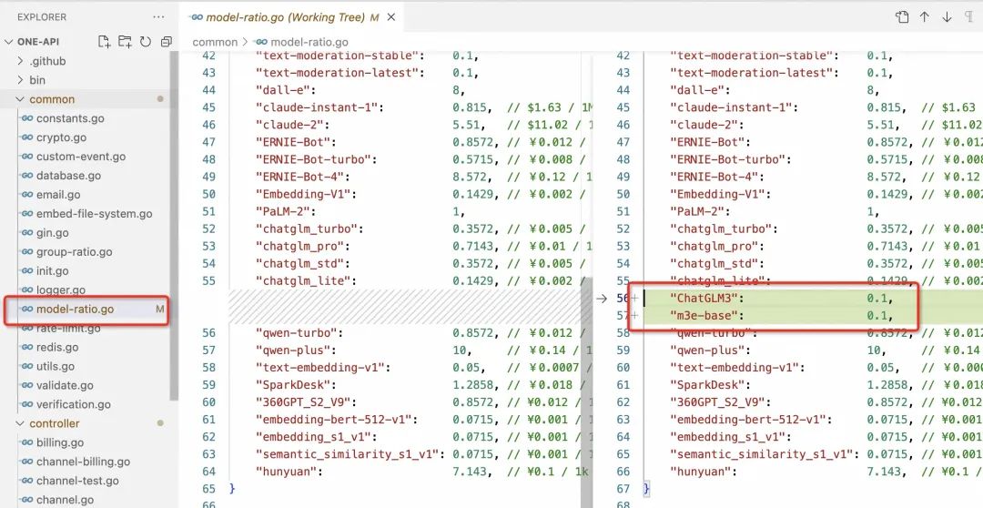改动涉及两个文件,分别是 common/model-ratio.go 和 controller/model.go,改动内容如下图: