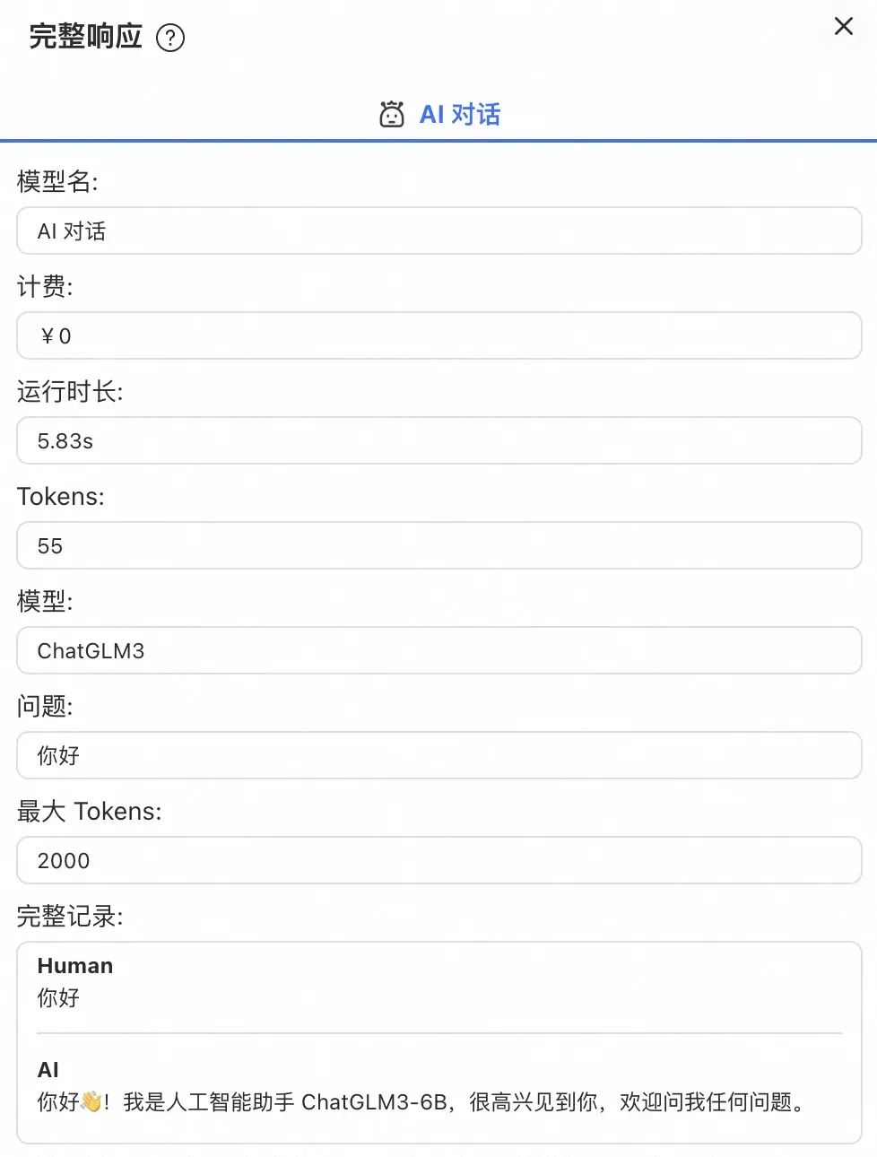 点开单条对话响应,详细的对话参数(消耗 token、响应时长、计费信息)清晰可见: