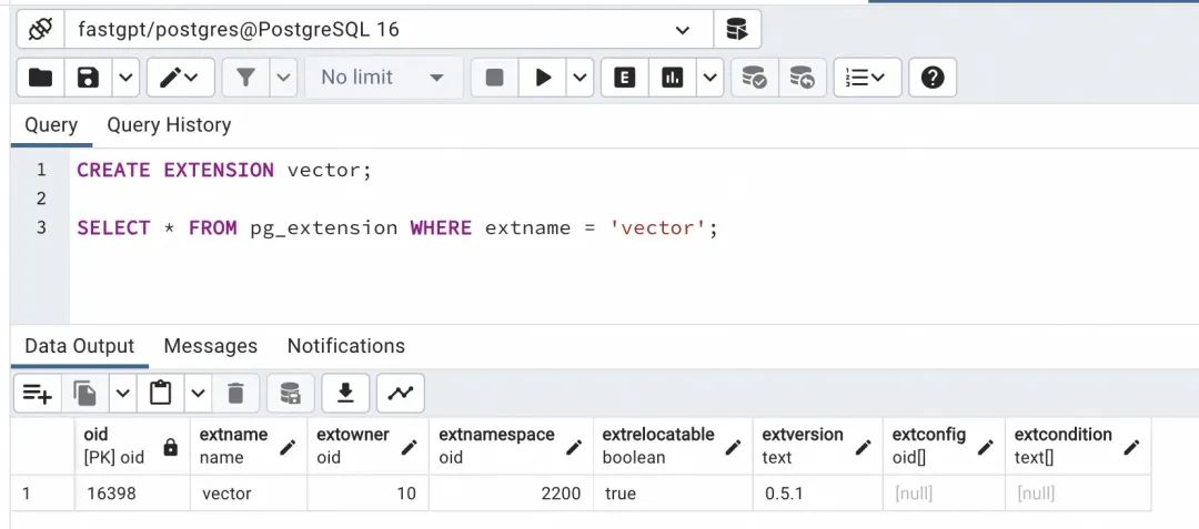 CREATE EXTENSION vector;SELECT * FROM pg_extension WHERE extname = 'vector';