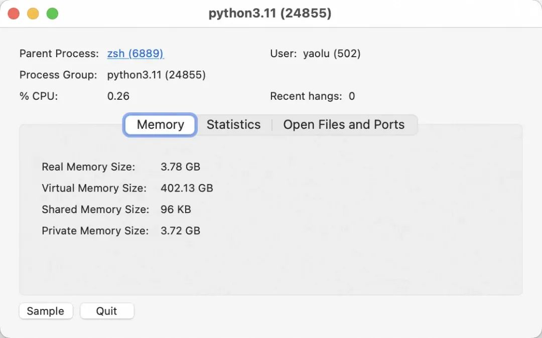 查看 MacBook 上的 ChatGLM3 推理资源占用情况,占用了 3.78GB 内存