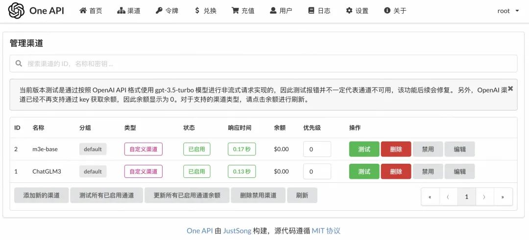 One API 的渠道管理界面如下图,我已经配置了俩渠道,一个 chat 渠道,一个 embedding 渠道: