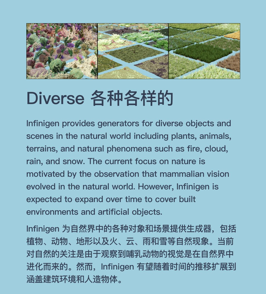 2. 多样化:Infinigen为自然世界中的多样化对象和场景提供生成器,包括植物、动物、地形,以及火、云、雨、雪等自然现象。当前对自然的关注是由于观察到哺乳动物的视觉在自然世界中进化。然而,预计Infinigen将随着时间的推移扩展到覆盖建筑环境和人造物体。