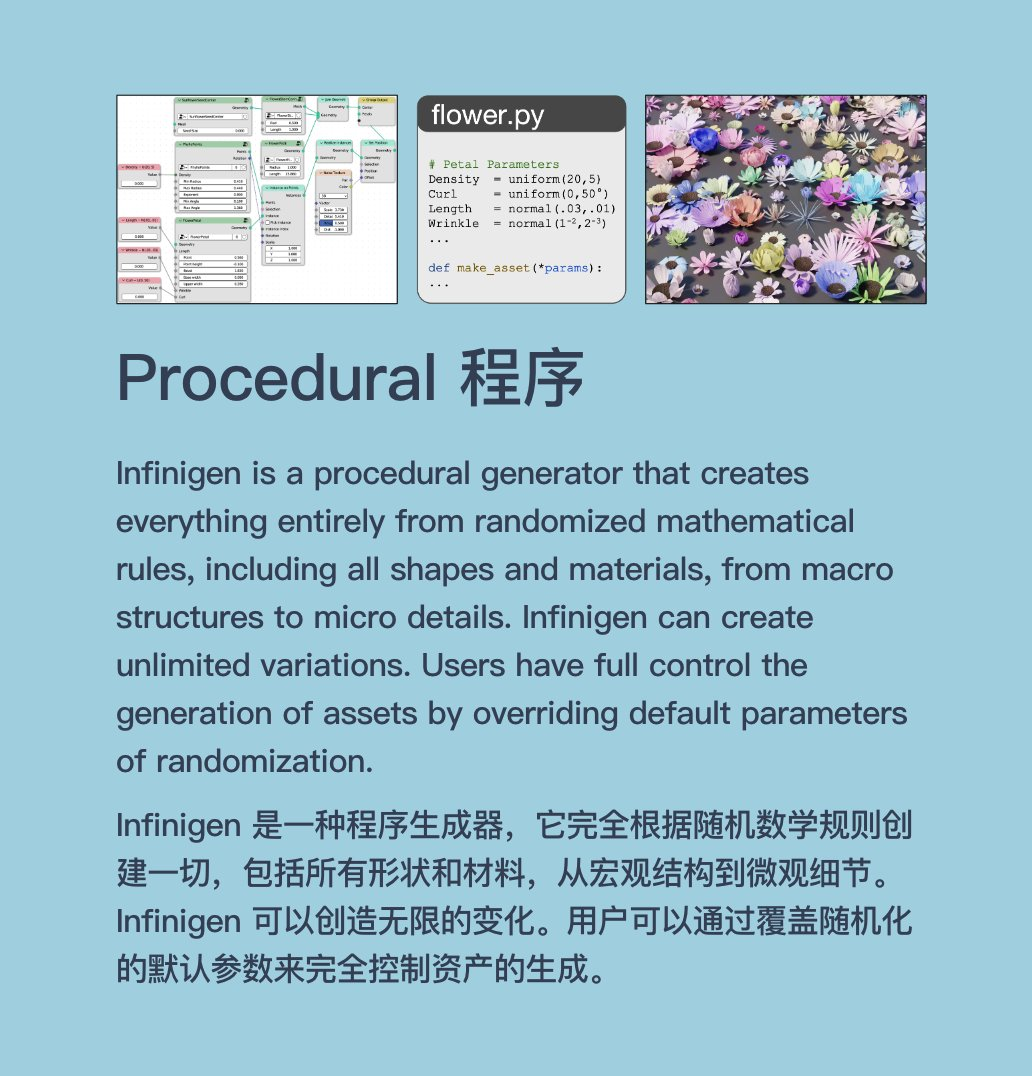 Infinigen 是无限高质量 3D 数据生成器,使用程序生成的无限逼真世界。这些数据 100% 通过程序化生成,不需要外部资产,也不依赖 AI,并且是免费开源的,生成质量非常高,据称可以达到以假乱真的地步,甚至是花瓣上的皱纹都可定制。