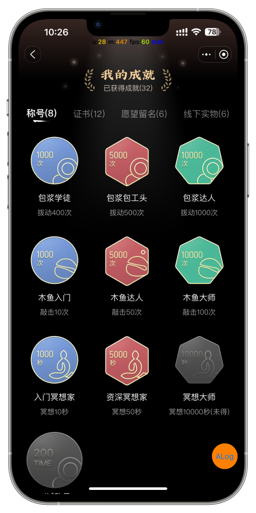 我们先简单了解下该模块的业务背景:静心守护的成就体系中有一类是称号,如下图。用户可以通过多种行为去解锁不同类型的称号,比如说通过参与主玩法(敲木鱼、冥想、盘手串),主玩法参与达到一定次数后即可解锁特定类型的称号。当然后续也可能会有其他种类的称号:比如签到类(按照用户签到天数解锁)、捐赠类(按照用户捐赠项目的行为解锁),所以对于称号的解锁操作应该是面向未来可持续拓展的。