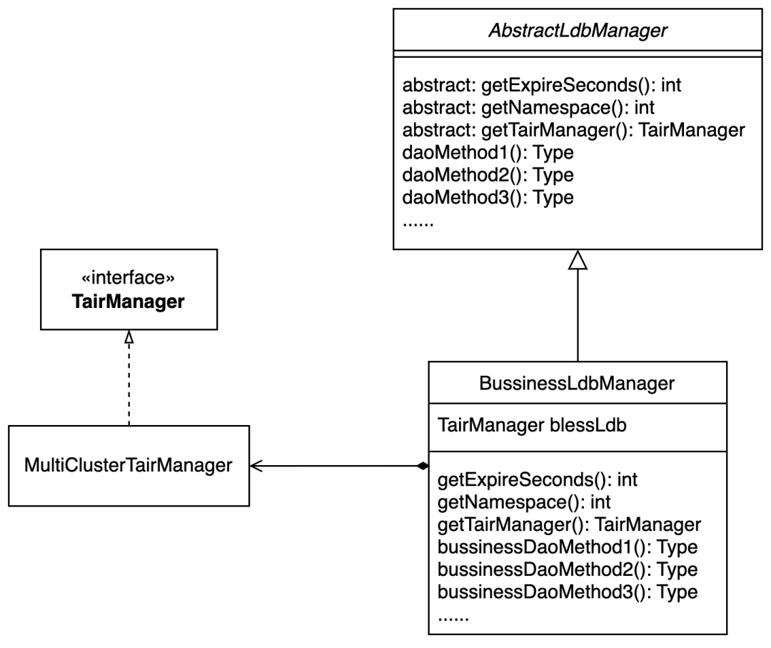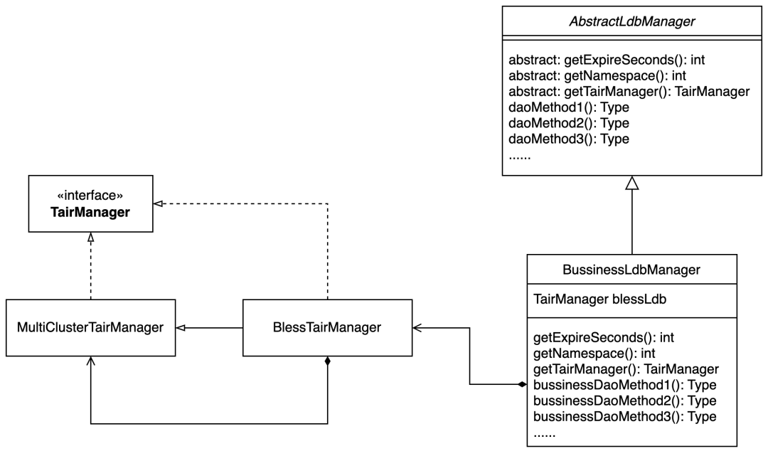 我们选择的解决方法则是从上面的MultiClusterTairManager入手,这个类是tair为我们提供的TairManger的一种默认实现,我们之前的做法是为该类实例化一个bean,然后提供给所有业务Tair管理类使用,也就是说所有业务Tair管理类使用的TairManager都是同一个bean实例(因为业务流量没那么大,一个tair实例暂时绰绰有余)。那么我们可以自己提供一个TairManager的实现,基于继承+组合MultiClusterTairManager的方式,只对我们项目内用到数据访问操作进行重写,并委托给原先的MultiClusterTairManager bean进行处理。这样我们可以在设置AOP切点时选择对自己实现的TairManager的所有方法做增强,进而避开上面的问题。经过这样改写后,上面的两张图会演变成下面这样: