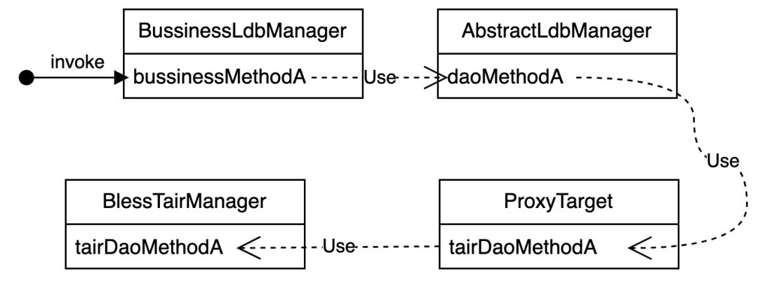 由于各个业务场景的tair管理实现类分散在各个业务包下,想要对它们进行统一切入比较困难。因此我们选择对抽象类进行切入。但这样就会遇到一个同类调用导致AOP失效的问题:抽象类本身不会有实例对象,因此基于CGLIB创建代理对象后,代理对象本质上调用的还是各个业务场景tair管理类的对象,而在使用这些对象时,我们不会直接调用tair抽象类封装的数据访问方法,而是调用这些业务tair管理对象进一步封装的带业务语义的方法,基于这些方法再去调用tair抽象类的数据访问方法。这种同类方法间接调用最终就导致了抽象类的方法没有如期被增强。文字描述兴许有些绕,可以参考下面的图: