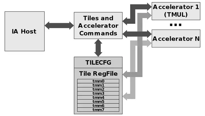 - Tiles: 由八个二维寄存器组成(命名为 tmm0, tmm1, …, tmm7),每个寄存器的最大尺寸为 16 行,每行有 512 位,尺寸为 1 KiB。整个Tiles的大小为 8 KiB。