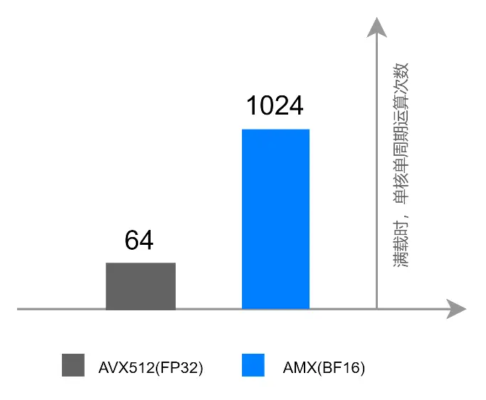 AMX 支持INT8 和 BF16数据类型,用于 AI 工作负载中的矩阵乘法运算。如图3b所示,第四代英特尔® 至强® 可扩展处理器可在单位计算周期内可执行 1024 次 BF16 运算,与第三代英特尔® 至强® 可扩展处理器执行 FP32 运算的次数64 次相比,有16倍的性能提升。