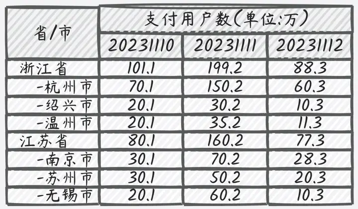 | 2023111101 | U001 | 2023-11-11 | 浙江省 | 杭州市 | 1.11 |