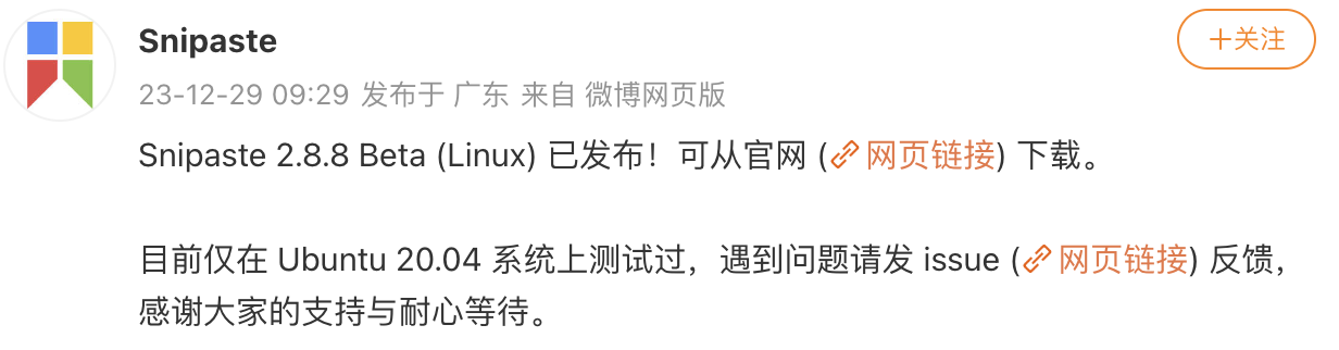 官方表示 Snipaste for Linux 目前仅在 Ubuntu 20.04 上进行过测试。若有问题可通过提交 issue 反馈。