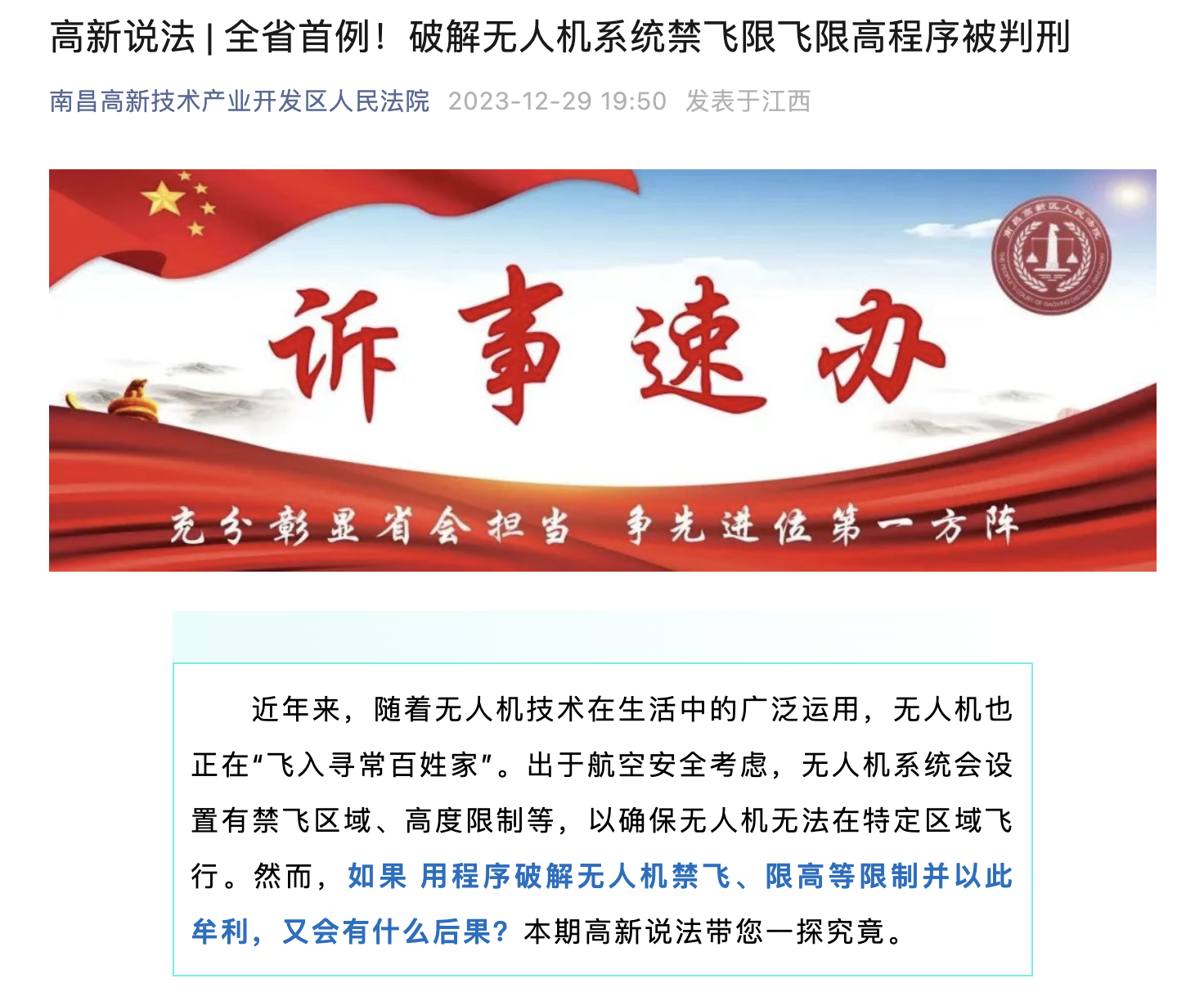 近日南昌法院介绍了一起“全省首例破解无人机系统禁飞限飞限高程序案”。