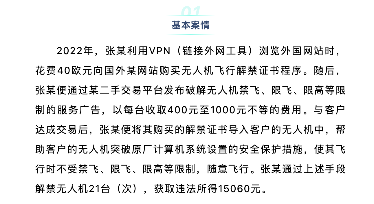 据介绍,犯罪嫌疑人张某曾花费40欧元,在外国一网站购买了飞行解禁证书程序。随后,他通过二手交易平台,向国内消费者出售解除“无人机限飞、限高、禁飞”等服务,每台收取400-1000元服务费。在被抓获前,张某已解禁了21台(次)无人机,违法收入15060元。