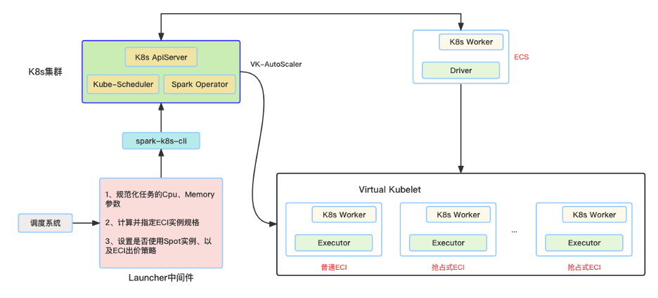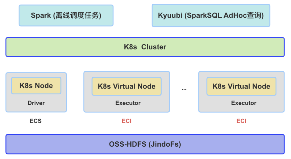 该架构简单易维护,底层利用 ECI 的弹性能力,Spark 任务可以较为轻松的应对高峰流量,将 Spark 的 Executor 调度在 ECI 节点上运行,可最大程度的实现计算任务弹性与最佳的降本效果,整体架构的示意图如下所示。