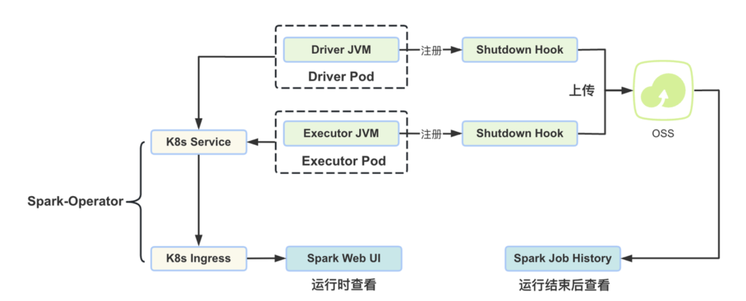 上图所示为日志的收集和展示原理,Spark 任务在启动时,Driver 和 Executor 都会首先注册一个 Shutdown Hook,当任务结束 JVM 退出时,调用 Hook 方法把完整的日志上传到 OSS 上。此外,想要完整查看日志,还需要对 Spark 的 Job History 相关代码做下改造,需要在 History 页面显示 stdout 和 stderr,并在点击日志时,从 OSS 上拉取对应 Driver 或 Executor 的日志文件,最终由浏览器渲染查看。另外,对于正在运行中的任务,我们会提供一个 Spark Running Web UI 给用户,任务提交成功后,spark-operator 会自动生成的 Service 和 Ingress 供用户查看运行详情,此时日志的获取通过访问 K8s 的 api 拉取对应 Pod 的运行日志即可。