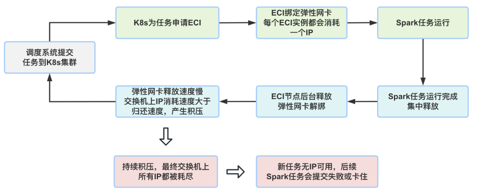 弹性网卡释放速度慢的问题,属于 ECI 大规模应用场景下的性能瓶颈,该问题会导致交换机上 IP 的剧烈消耗,最终导致 Spark 任务卡住或提交失败,具体触发原因如下图所示。目前阿里云团队已通过技术升级改造解决,并大幅提升了释放速度和整体性能。