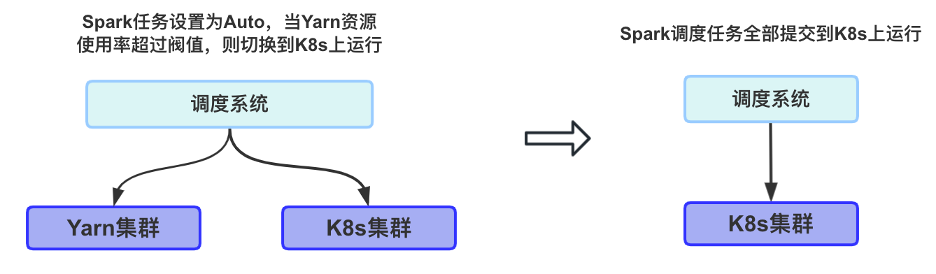 在我们的调度系统中,Spark 任务支持配置 Yarn、K8s、Auto 三种执行策略。如果用户任务指明了需要运行使用的资源管理器,则任务只会在 Yarn 或 K8s 上运行,若用户选择了 Auto,则任务具体在哪里执行,取决于当前 Yarn 队列的资源使用率,如下图所示。由于总任务量较大,且 Hive 任务也在不断迁移至 Spark,目前仍然有部分任务运行在 Yarn 集群上,但最终的形态所有任务将由 K8s 来托管。