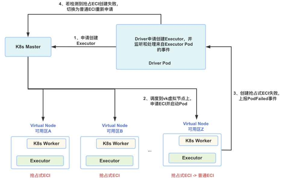 ECI 分为普通实例和抢占式实例,抢占式实例是一种低成本竞价型实例,默认有 1 小时的保护期,适用于大部分 Spark 批处理场景,超出保护期后,抢占式实例可能被强制回收。为进一步提升降本效果,充分利用抢占式实例的价格优势,我们对 Spark 进行改造,实现了 ECI 实例类型自动转换的功能。Spark 任务的 Executor Pod 都优先运行在抢占式 ECI 实例上,当发生库存不足或其他原因无法申请创建抢占式实例,则自动切换为使用普通 ECI 实例,保证任务的正常运行。 具体实现原理和转换逻辑如下图所示。