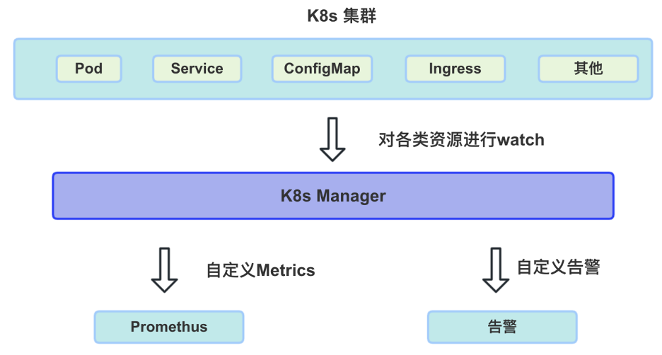 在 Spark on K8s 场景下,尽管 K8s 有集群层面的监控告警,但是还不能完全满足我们的需求。在生产环境中,我们更加关注的是在集群上的 Spark 任务、Pod 状态、资源消耗以及 ECI 等运行情况。利用 K8s 的 Watch 机制,我们实现了自己的监控告警服务 K8s Manager,下图所示为该服务的示意图。