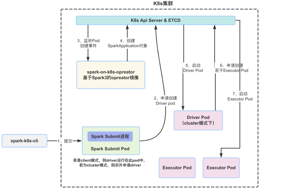 通过 spark-submit 命令直接提交,Spark 原生就支持这种方式,集成起来比较简单,也符合用户的习惯,但是不方便进行作业状态跟踪和管理,无法自动配置 Spark UI 的 Service 和 Ingress,任务结束后也无法自动清理资源等,在生产环境中并不适合。