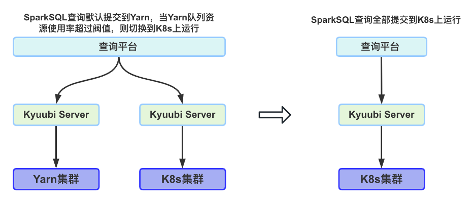 Kyuubi 是一个分布式和多租户的网关,可以为 Spark、Flink 或 Trino 等提供 SQL 等查询服务。在早期,我们的 Spark Adhoc 查询是发送到 Kyuubi 上执行的。为了解决 Yarn 队列资源不足,用户的查询 SQL 无法提交和运行的问题,在 K8s 上我们也支持了 Kyuubi Server 的部署运行,当Yarn资源不足时,Spark 查询自动切换到 K8s 上运行。鉴于 Yarn 集群规模逐渐缩减,查询资源无法保证,以及保障相同的用户查询体验,目前我们已将所有的 SparkSQL Adhoc 查询提交到 K8s 上执行。