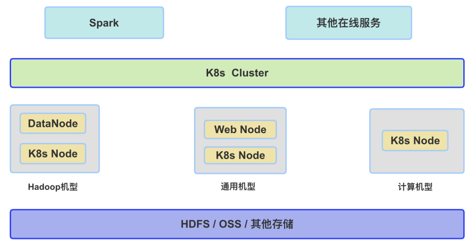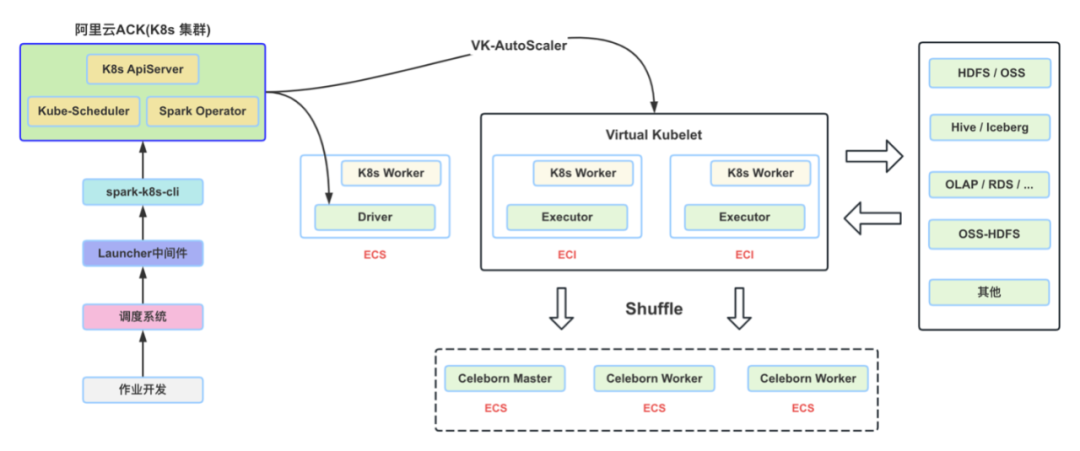 Spark 运行在 K8s 之上,完全使用 K8s 集群的计算资源,而访问的则数据也由 HDFS、OSS 逐步切换到 OSS-HDFS 上,中间 Shuffle 数据的读写采用 Celeborn,整套架构实现了计算和存储的解耦,易于维护和扩展。