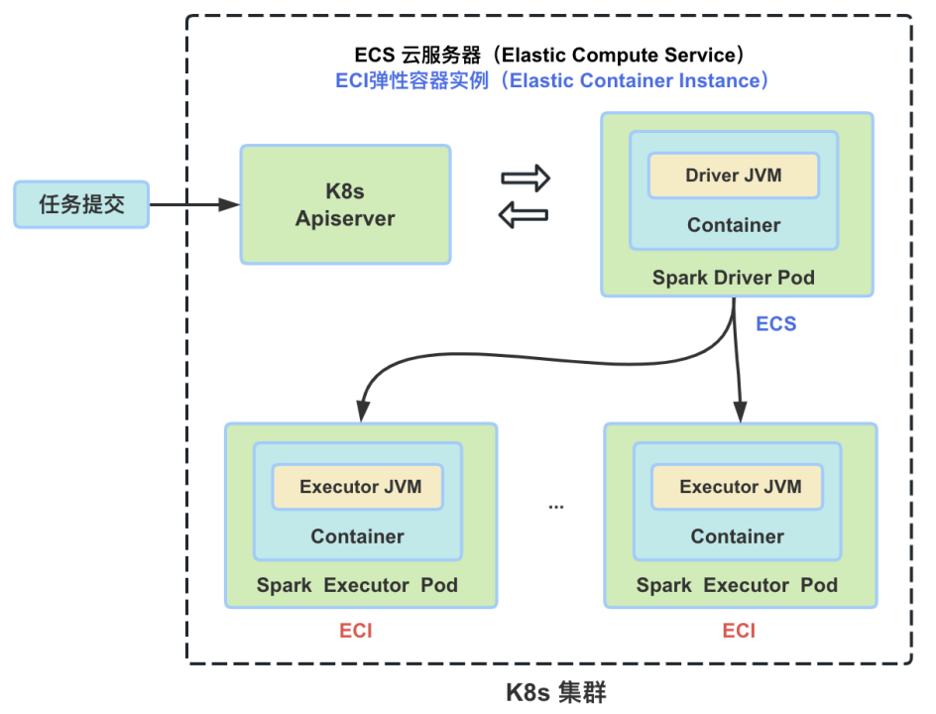 弹性容器实例 ECI 是一种 Serverless 容器运行服务,ECI 和 ECS 最大的不同就在于 ECI 是按量秒级计费的,申请与释放速度也是秒级的,所以 ECI 很适合 Spark 这一类负载峰谷明显的计算场景。