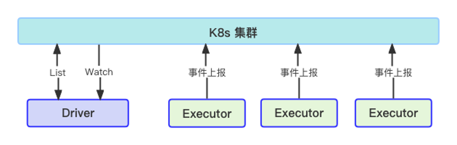 如上图所示,Driver 通过 List 和 Watch 两种方式来获取 Executor 的运行状况。Watch 采用被动监听机制,但是由于网络等问题可能会发生事件漏接收或漏处理,但这种概率比较低。List 采用主动请求的方式,比如每隔 3 分钟,Driver 可向 Apiserver 请求一次自己任务当前全量 Executor 的信息。