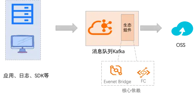 为了提升研发效率,云消息队列 Kafka 版联合阿里云产品支持到无代码、全托管、Serverless 化的功能特性,支持从云消息队列 Kafka 版到 OSS 的转储。该功能特性的优势有: