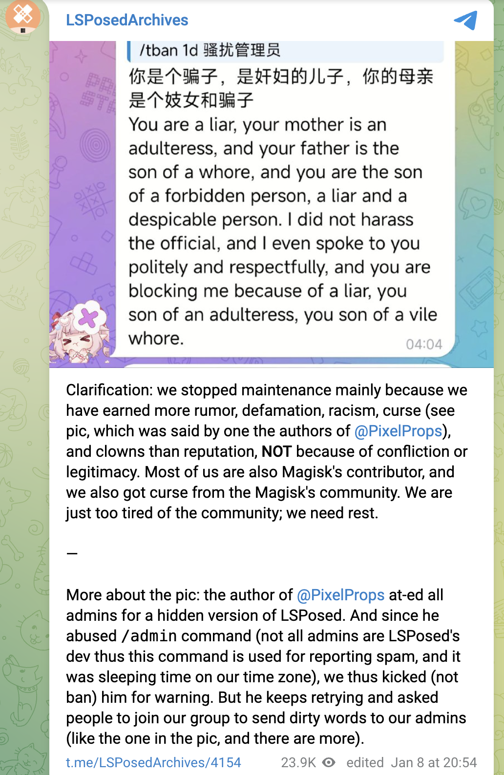对于停止开发的原因,开发者在其订阅频道中表示停止维护的主要原因是出现许多谣言、诽谤、种族主义和咒骂等。同时开发者也受到 Magisk 社区的一些咒骂,因此开发者决定休息,停止开发和维护。