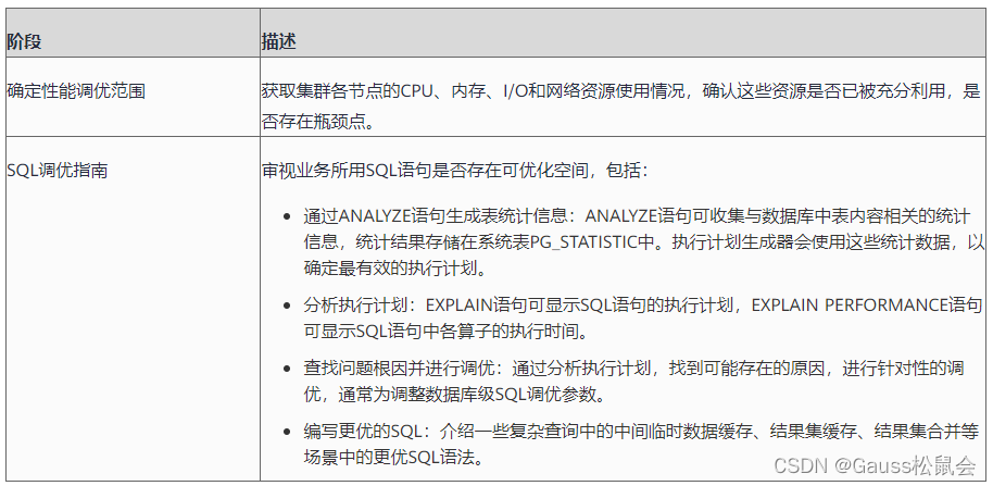 GaussDB性能调优过程需要综合考虑多方面因素,因此,调优人员应对系统软件架构、软硬件配置、数据库配置参数、并发控制、查询处理和数据库应用有广泛而深刻的理解。