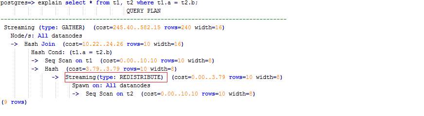 CREATE TABLE t1 (a int, b int) DISTRIBUTE BY HASH (a); CREATE TABLE t2 (a int, b int) DISTRIBUTE BY HASH (a);