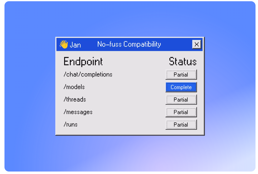Jan在 localhost: 1337 提供了一个与 OpenAI 等效的 API 服务器,可以用作兼容应用程序的直接替代品。