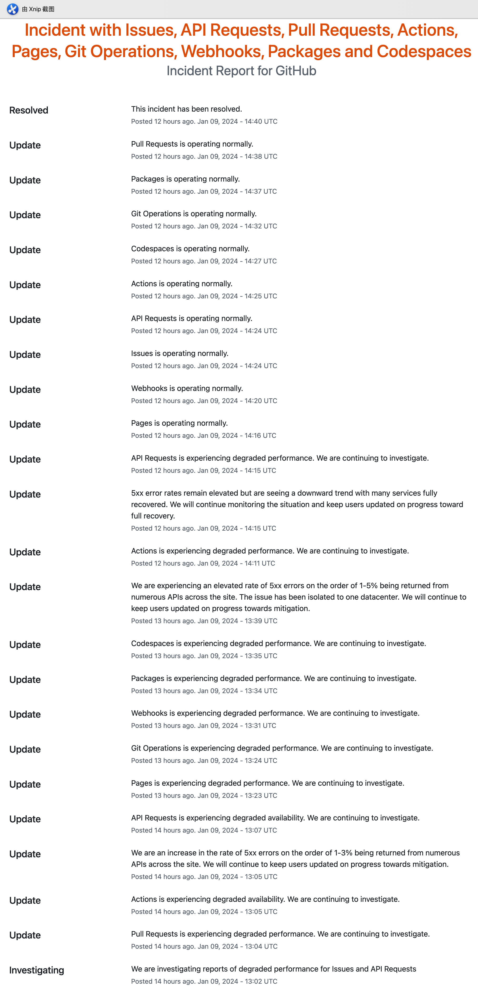 GitHub 多项服务昨天出现了故障,具体表现为众多 API 都出现了 HTTP 5xx 错误,错误率上升了 1%~5%,涉及的服务包括但不限于: