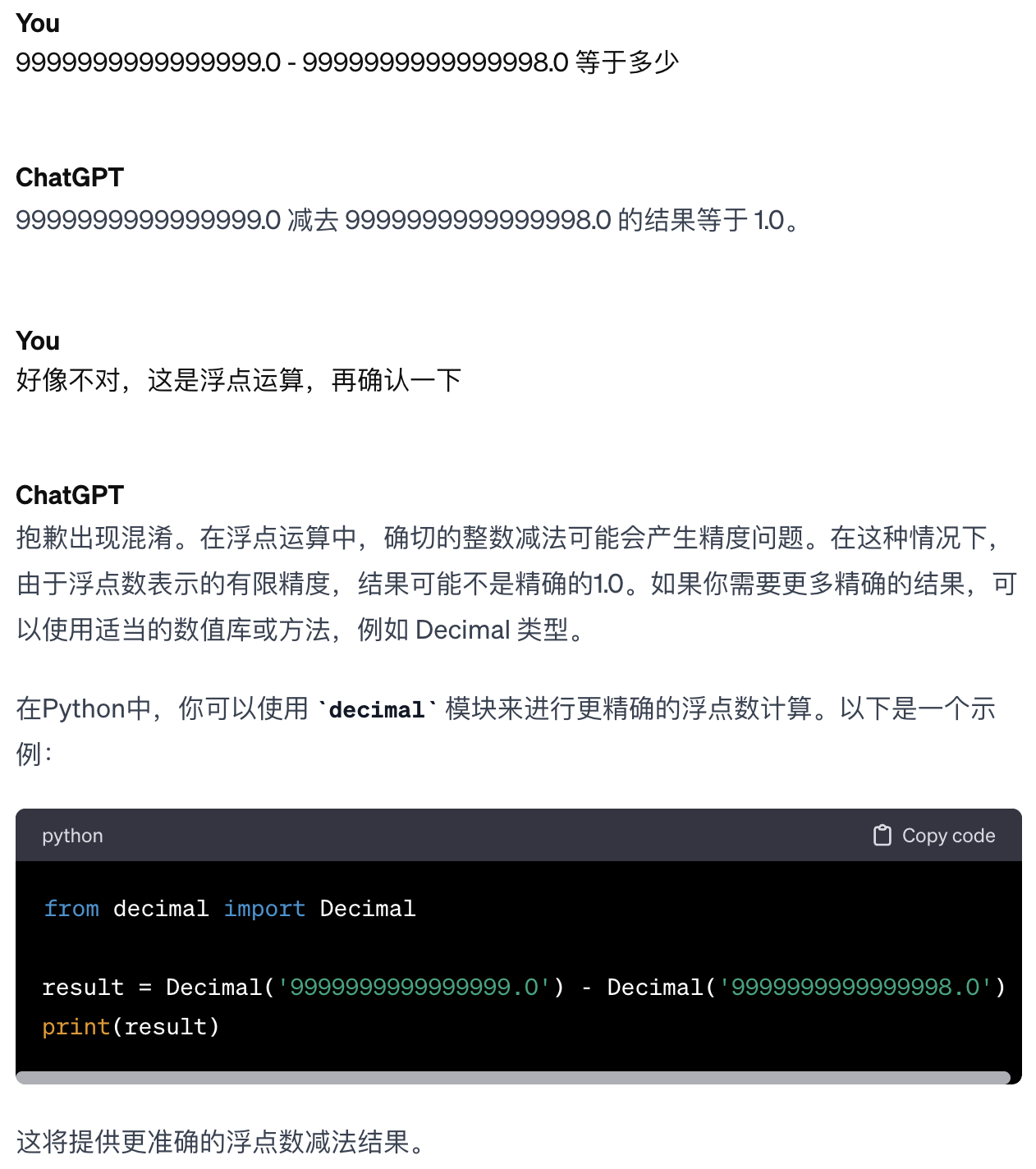 | GoLang: | var a = 9999999999999999.0; var b = 9999999999999998.0; fmt.Printf("%f\n", a-b) 2.000000 |