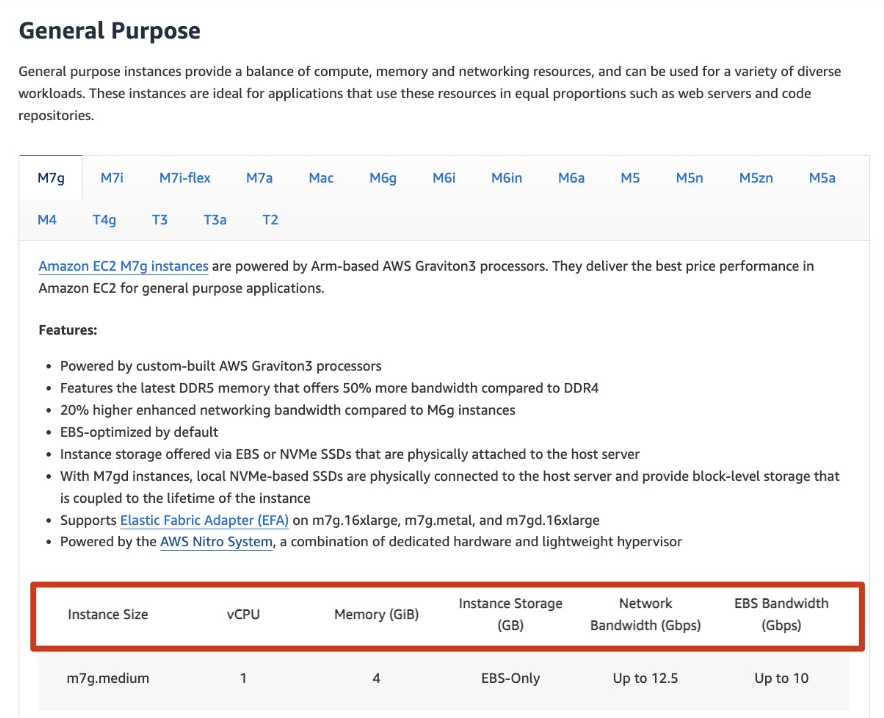一般来说,每一个具体的 EC2 型号都从属于某个带有相应数字序号的 Family,比如以 General Purpose 类型的 M 系列为例: