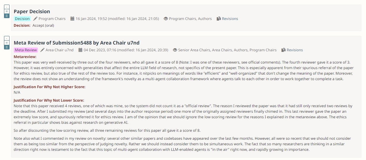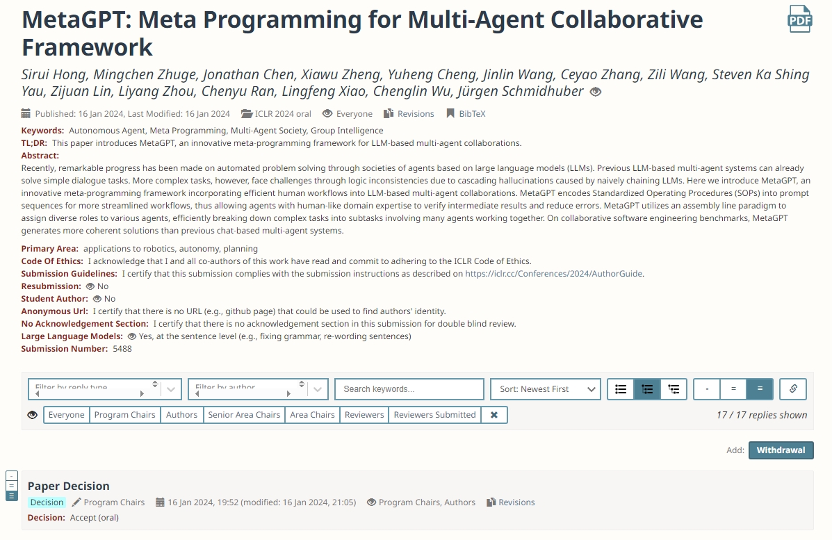 ICLR 2024 录用结果公布,MetaGPT 喜提 ICLR 2024 Oral (1.2%)