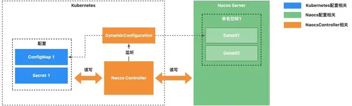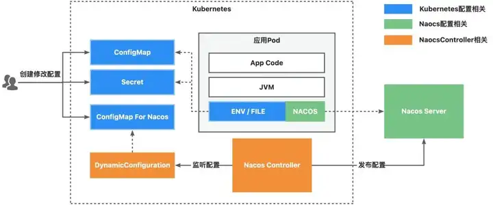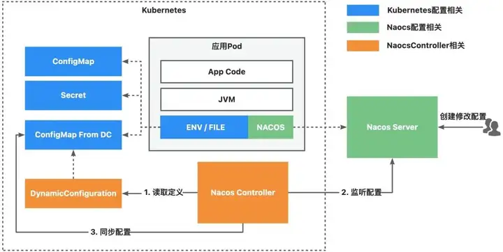 当前 NacosController 项目已经实现了 DynamicConfiguration 概念(后文简称 DC)。通过这个概念,我们可以定义 Nacos 配置与 K8s 配置的同步策略,进而使用 Kubernetes 标准运维接口管理 Nacos 配置。当然,打开一下“脑洞”,我们也可以通过这个概念使用 Nacos 管理应用的常见运行时配置(如环境变量、文件系统)。