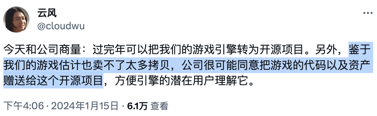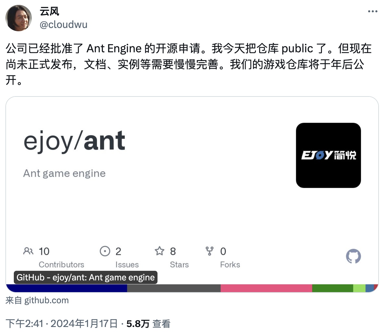 云风表示其所在公司已批准 Ant Engine 的开源申请,仓库已对外开放,但现在尚未正式发布,文档、示例等均待在 Wiki 上逐步完善,游戏仓库将于年后公开。