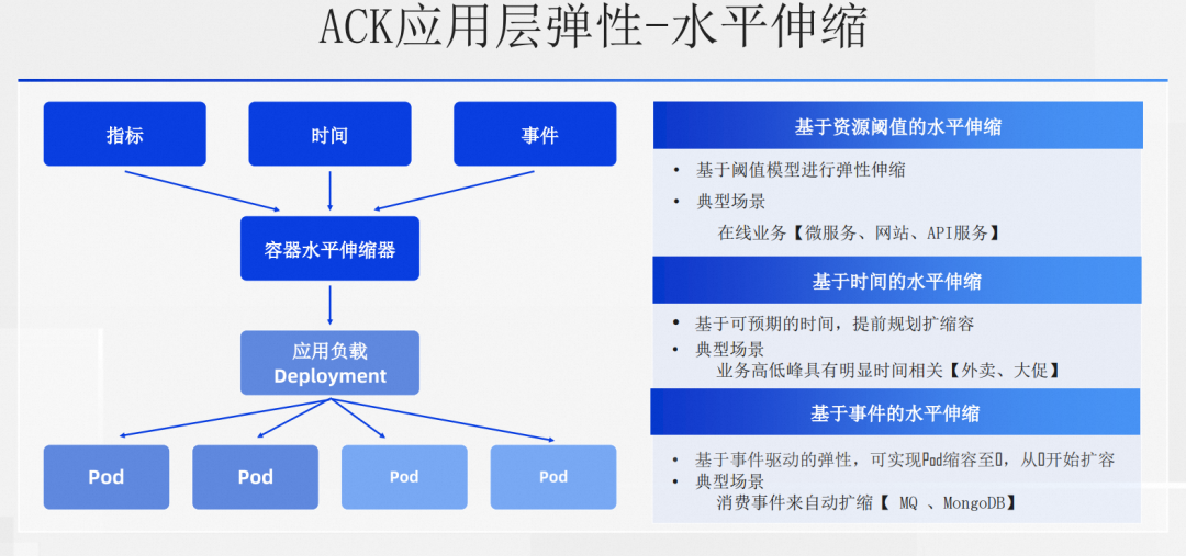 首先我们先来看应用层的水平伸缩。先看触发源,从触发源的类型可以分成 3 大类,指标、资源和事件。基于指标或者说资源阈值模型的就是咱们最常见的 HPA,HPA 适合业务高低峰能用指标来描述的业务,比如有的微服务业务高低峰会反映在 CPU、内存这类资源指标上,再比如说网站或者 API 可以通过访问量来决定是否需要扩缩,这些都是比较适合 HPA 的场景。