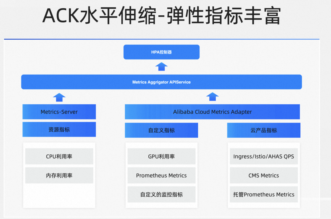 对于不同的业务场景,对于不同的这个业务形态,简简单单的 CPU 跟内存是没有办法满足业务的诉求的。那阿里云在 HPA 弹性指标这个维度做的事情,就是找到合适不同业务场景的伸缩指标,来进行丰富,让这个链路使用起来更简单。