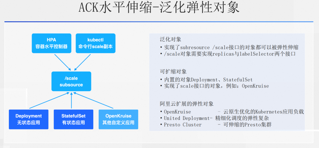 伸缩指标再往下是伸缩对象,我们知道 HPA 的伸缩对象是哪些呢?可以伸缩 Deployment,可以伸缩 Statefulset,实际上 HPA 不关心具体的伸缩对象是 Department 还是 Statefulset。它实际上感知的是一个泛化的 scale subresource。也就是说只要实现了 subresource 这种资源对象,它就能够被 HPA 管理,被 HPA 伸缩。所以在伸缩对象这个维度上,我们找到有哪些领域场景是需要去定义成一个伸缩对象的,然后进行支持。比如说阿里云 ACK 在 Spark 和 Presto Cluster 上面去做了对应的 CRD,并且这些 CRD 同样也是可以被 HPA 去接管的,满足这些领域场景的自动水平伸缩的这个需求。