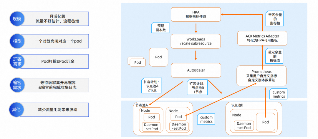 - 缩容需求: 为了保证玩家体验,用户希望有玩家的 Pods 及其所在 Node 能等待玩家离场后再缩容,并且需要在节点缩容前去收集一些数据和日志,节点同时也需要在数据和日志收集完成后缩容,否则会导致数据或日志缺失。
