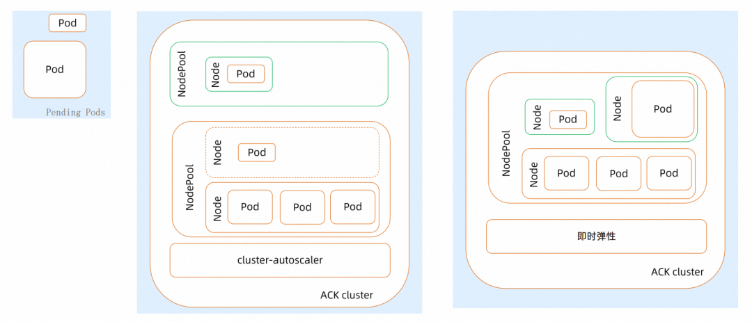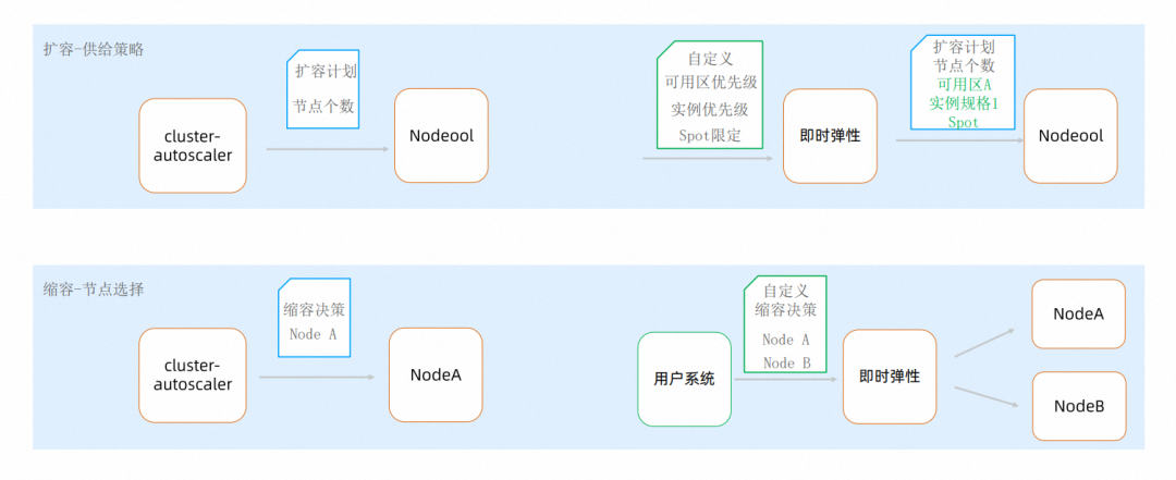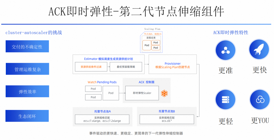 - 更准: 即时弹性摒弃了第一代弹性组件的 One Nodepool One Virtual Node 的抽象方式和预调度装箱模式,在扩容时候决策从简单的只包含节点个数的 Scaling Rule,扩充到支持具体实例规格的 Scaling Plan,使得扩容更准。
